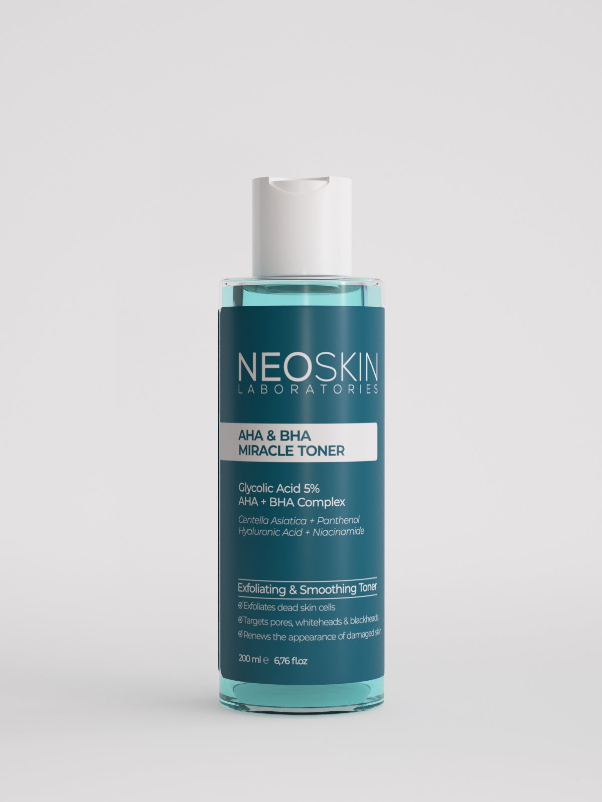Neoskin AHA & BHA Miracle Toner içerdiği AHA ile cildin ölü deri hücrelerinden, fazla sebum ve yağdan arındırılmasına, BHA ile tıkalı gözeneklerin açılmasına ve cildin canlanmasına yardımcı olur. %5 Glikolik asit içeren formülü cilde günlük eksfoliasyon bakımı sunar, cildin tazelenmesini ve canlanmasını destekler.